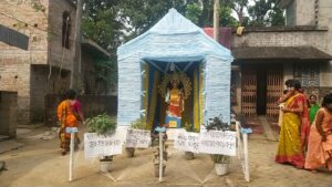 মলয় দে নদীয়া:-নদীয়ার শান্তিপুর শহরে তিন নম্বর ওয়ার্ডের দু’নম্বর রামগোপাল সেন স্ট্রিটের বাইগাছি সেনপাড়ায় লক্ষ্মী দেবীর হাতে পদ্মের বদলে ঝুলছে মাস্ক। ওই এলাকারই নিউ স্টার ক্লাবের মহিলা সদস্যদের উদ্যোগে ১২ বছর ধরে পূজিত হয়ে আসছেন মা লক্ষী। গতবছরের সুবিশাল প্যান্ডেল, ঠাকুরের আকার ,শোভাযাত্রা সবটাই বাতিল করেছেন সাধারণ মানুষের স্বার্থে সরকারি স্বাস্থ্যবিধি মেনে । ঠাকুরের আকৃতি কিছুটা ছোটো হলেও মা লক্ষ্মীর হাতে পদ্মফুলের বদলে জুটেছে মুখ আবরণী অর্থাৎ মাস্ক । এমনকি গোটা প্যান্ডেলটি নিজেরাই নির্মাণ করেছেন অব্যবহৃত প্রায় তেরোশো মাস্ক দিয়ে।