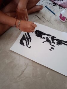 প্রথমত কালোজিরে দিয়ে রবীন্দ্রনাথ ঠাকুরের পোট্রেট অংঙ্কন। এ ফোর সাইজের পৃষ্ঠায়, দীর্ঘদিন ধরে স্বাভাবিক থাকার গুণসম্পন্ন কালোজিরাকে বেছে নিয়েছে সে।